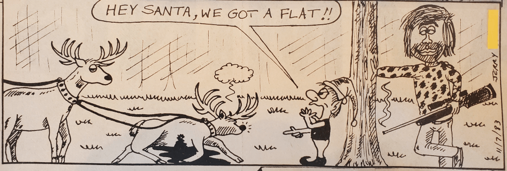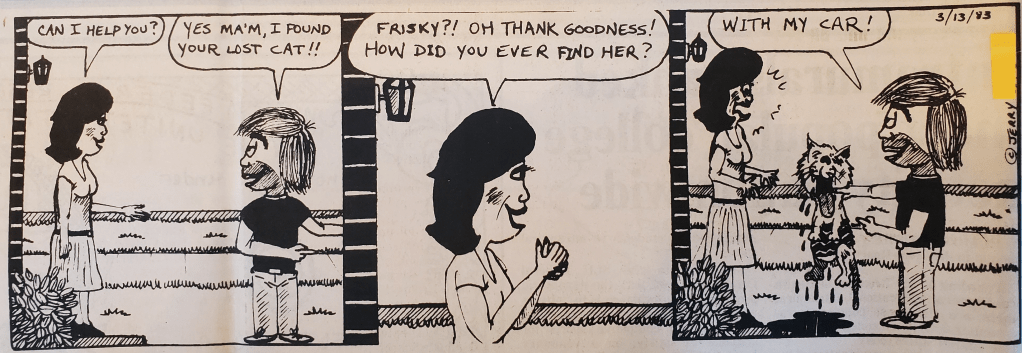 One thing my father taught me was responsibility. He taught us to that you should work hard and earn what you get. When I was in high school and was dressed and ready to leave on a Friday night, I would would ask him for some money to go out with my friends. He would say “Sure! Go rake the yard first!” Needless to say when he told me to get a job because “College isn’t a free ride!” I took his teachings seriously and applied for the easiest, most “cush” on-campus job. I applied with our school newspaper, The Lion’s Roar, and was hired to sell advertising in the paper and as an illustrator/cartoonist. John did the same and was hired as the head photographer. It was a match made in heaven. This was against school policy as you could not hold and be paid for two separate on-campus jobs, but yet I did given the campus administrators were inept. Selling advertising to local businesses got me connected to every bar in Hammond, LA. I rarely paid for drinks. Being the cartoonist gave me a communications platform to drive the university administration batshit. Fortunately, our department supervisor, Rick, was equally demented as John and I. He was our “mentor”. Many times I would walk into Rick’s office to see him looking out his window with a pair of binoculars. Unfortunately, he wasn’t bird watching. He was watching young female coeds walking to their classes. He had a prime window view that overlooked one of the main walkways on campus. He would say “Jerry! Come over here and check out the rack on the girl in the green shirt!” Given he was my boss, I felt uncomfortable telling him no. That and the fact that I was a man and a pig (not necessarily in that order). While a dirty old man with an appreciation for ogling young female students, Rick saved our asses on more than one occasion. He personally bailed John out of jail and saved me from repeated calls by the Dean to have me fired. But that’s another story. The Lion’s Roar became our personal playground. And we used it to our full advantage.