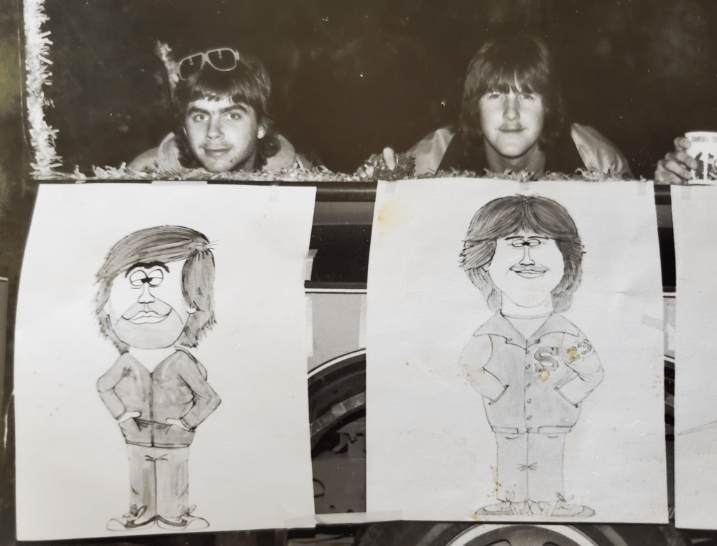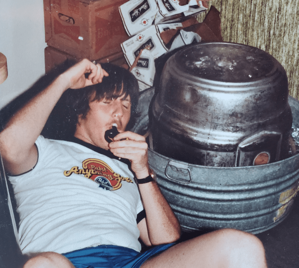 I would be remiss if I ended this saga without elaborating further on our good friend Randy. The Nasty John saga would not have been the same without his ridiculous and ludicrous participation and agreement to go along with everything we suggested. Randy, like John, was a photographer for the school paper. He was obsessed with the band KISS, chemical experimentation and wreaking havoc with John and I. Randy was part of our regular running crew and was present for most of the catastrophic events we caused. As stated above, he eventually became our roommate when we moved into our off-campus apartment. One night, John, Randy and I were driving around looking for somewhere we could get in trouble. We were running low on fuel so we stopped to fill-up at a local Raceway gas station. While we were gassing-up, John and I hatched a scheme to get some free alcohol. We told Randy to go smoke a cigarette away from the gas pumps near the outdoor beer display. Back then, gas stations would stack cases of beer outside the store that were “On Special.” The plan was that when we were finished gassing-up and paying, we would give Randy the signal and he would grab a case of beer, run to the car, get in and we would haul ass. We gave the signal. Randy stomped out his cigarette, looked over his shoulder to see if the cashier was looking, then grabbed a case of beer and started running towards the car. As he awkwardly approached our vehicle, that’s when John and I jumped in the car and drove off, leaving Randy standing in the middle of the gas pumps with a stolen case of beer. Knowing he was in deep shit, he tried to think of his next move. There was Randy, his feet moving up-and-down in a side-to side jogging motion, head looking left and right, like a leprechaun doing an Irish jig or someone who was about to crap their pants. Making his final decision, he dropped the beer and took-off running. John and I drove around for a couple of hours, drinking beer and giving some time for the police to get their statements and clear out. As we drove back near the store, a darkened, hairy blur came flying out of the woods, across a ditch and dove onto the hood of the car. It was Randy. He’d been hiding in the woods for two hours, covered in mosquito bites, briar scratches and pissed off to high heavens. He said that the police drove by shining their spot lights in the woods and almost caught him. We gave him a cold beer and he was fine. We all had a good laugh (except Randy). How he stayed our friend I’ll never know.